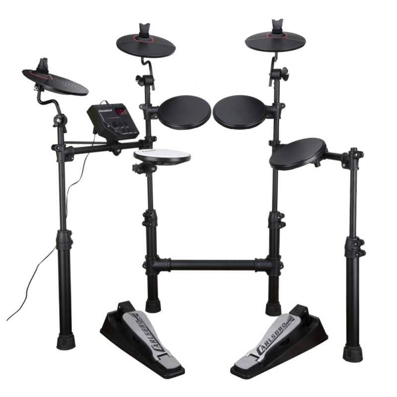 Das 7-teilige E-Drum-Kit CSD101 von Carlsbro besteht aus dem Soundmodul Commander 100, 4 Drum-Pads, 3 Becken, einschließlich eines Zweizonen Ride Beckens und einem teleskopischen, vollständig höhenverstellbaren Rack.