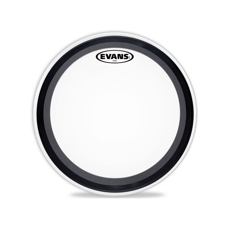 Evans EMAD White Coated Bassdrum Schlagfell mit EMAD Dämpfungssystem. Das von Evans entwickelte Emad-System dämpft mit einem außen angebrachten Ring und macht weiteres Abdämpfen der Bassdrum überflüssig. Mit seiner Hilfe lässt sich der Sound mit wenigen Handgriffen verändern.